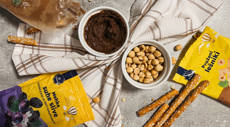 Lahko pa namesto lešnikov uporabimo tudi že pripravljen 100% lešnikov namaz Odlično in dodamo še ostale sestavine.