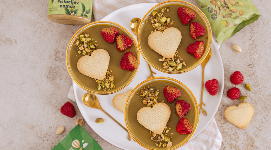 Ta sladica je prava paša za oči in brbončice. Kremasta panakota z bogatim pistacijevim pridihom, hrustljavimi pistacijami in svežimi malinami je popolna izbira za posebne priložnosti ali razvajanje ob koncu tedna. Recept je preprost, rezultat pa izjemno eleganten – še posebej, ker v njem uporabimo pistacijev namaz in pražene neslane pistacije, ki sladici dodajo globino okusa in teksturo.